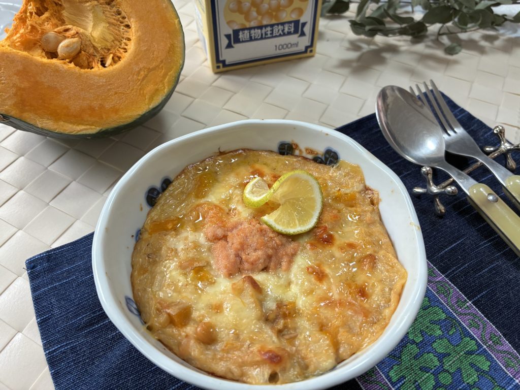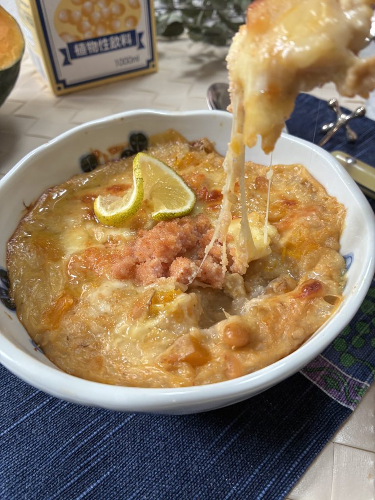 海と畑の美活ドリア「🍽️かぼちゃと大豆の豆乳めんたいドリア(エビ&ホタテ入り)」
